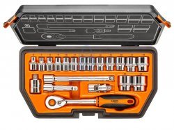 Sada 3/8" hlavic je 20 dílná gola sada. Nástrčné hlavice jsou vyrobeny z vysoce kvalitní chrom-vanadiové oceli (CrV) pro zajištění maximální životnosti nářadí a odolnosti vůči korozi. Hlavice mají 3/8" upínání. V sadě naleznete vyhnutou ráčnu s kvalitním mechanismem se 48 zuby. Sadu doplňují 2 ks prodloužení, univerzální kloubový nástavec a redukce. Celá sada je dodávána v praktickém plastovém kufříku pro lepší přenášení a skladování. O kvalitě nářadí vypovídá německý TÜV certifikát.
