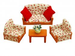 Nábytek - sedací souprava se stolečkem je další z řady doplňků herní řady Sylvanian family, který nesmí chybět v žádném z domečků. Sestava zahrnuje pohodlnou pohovku, doplněnou 2 křesly, stolečkem a vázičkou s květinou.
