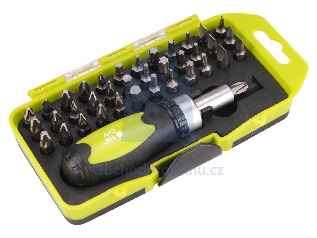 38 dílná sada obsahuje ráčnový šroubovák a bity. Součástí sady jsou bity velikosti 1/4" pro plochou, PH, PZ, TORX a imbus drážku vyrobené z kvalitní chrom-vanadové oceli. Sada je dodávána v zavíracím plastovém pouzdře.