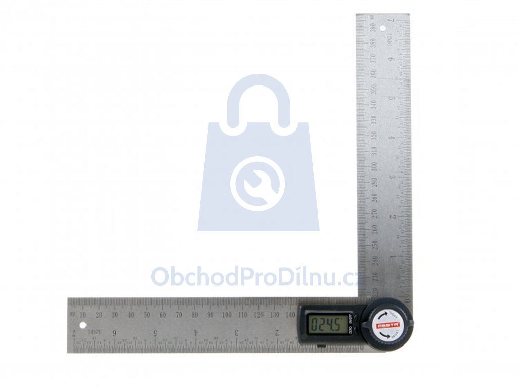 Digitální úhloměr od výrobce FESTA pro měření vnitřích a vnějších úhlů. Je vybaven zajišťovacím šroubem pro přidržení určitého úhlu. Měřícího rozsahu ± 360° a přesnost ± 0,3°. Výhodou je nastavení nuly v libovolné poloze. Stupnice pravítka 1 mm a 1/32 palce. Průřez pravítka 35 x 2,5 mm. Dva montážní otvory. Aretace šroubek. Napájení 1 baterie typu CR2032 3V.